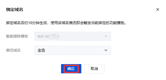 3. 在域名绑定窗口中,选择您需绑定的智能擦除模板及推流域名(可同时绑定多个推流域名)单击确定即可绑定成功。