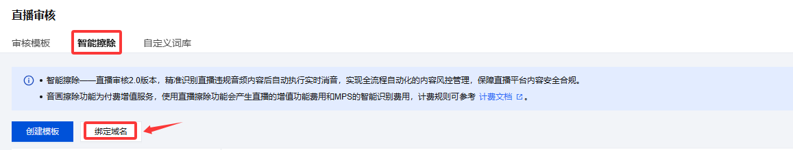 1. 登录 云直播控制台, 在左侧导航栏中,选择功能配置 > 直播审核 > 智能擦除。 2. 通过以下方式进入域名绑定窗口: