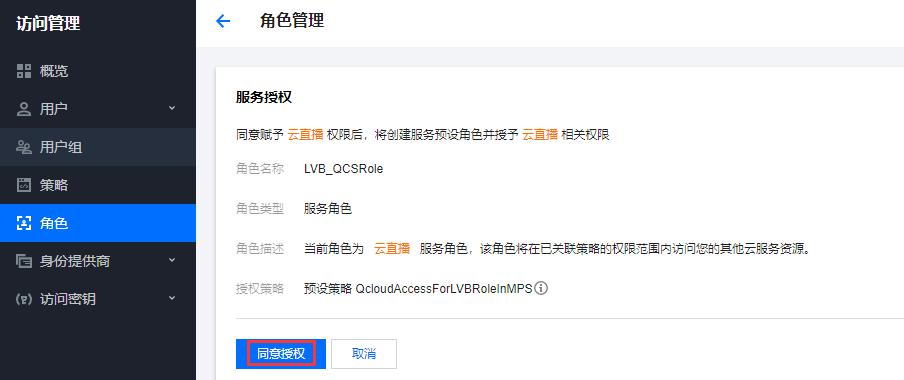 3. 在角色管理页面,单击同意授权,完成身份校验后即可完成媒体处理授权,正常使用媒体处理服务。