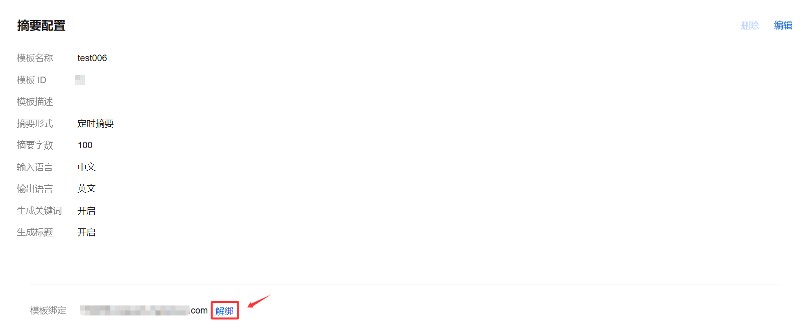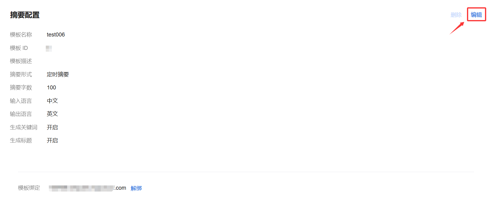 创建智能摘要模板成功后关联域名: 摘要模板创建成功后,单击提醒框中的去绑定域名。