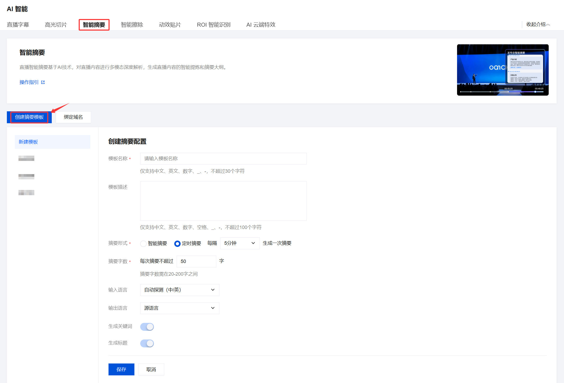 1. 登录 云直播控制台,进入 AI 智能 > 智能摘要 。 说明: