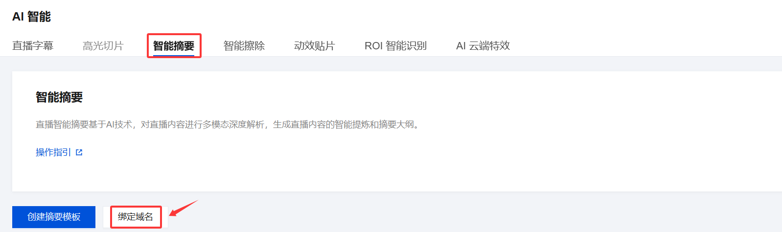 1. 登录 云直播控制台,进入 AI 智能 > 智能摘要 。 2. 通过以下方式进入域名绑定窗口: