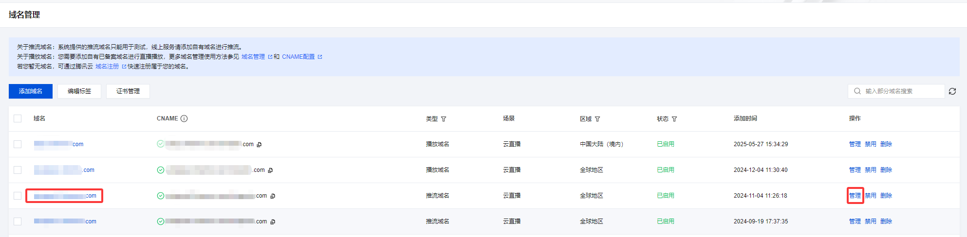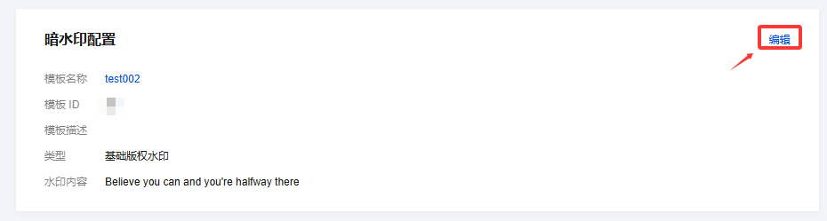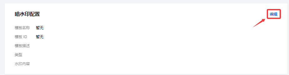 1. 进入 域名管理,单击需配置的推流域名或管理进入域名详情页。 2. 选择模板配置页签,单击暗水印配置标签右上角的编辑。