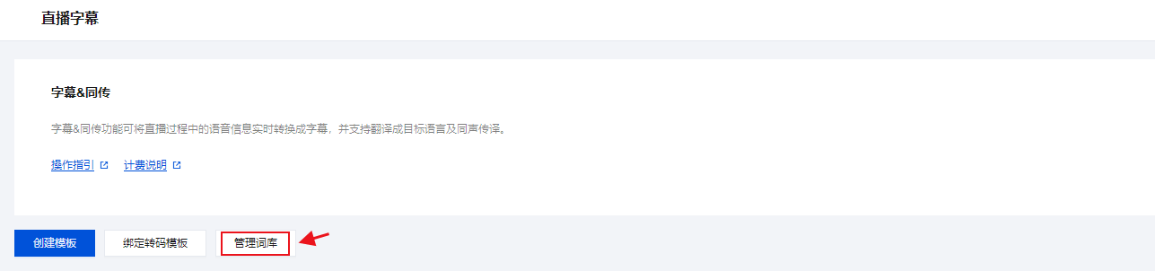 1. 登录 云直播控制台,选择 AI 智能 > 字幕&同传 ,然后单击管理词库
