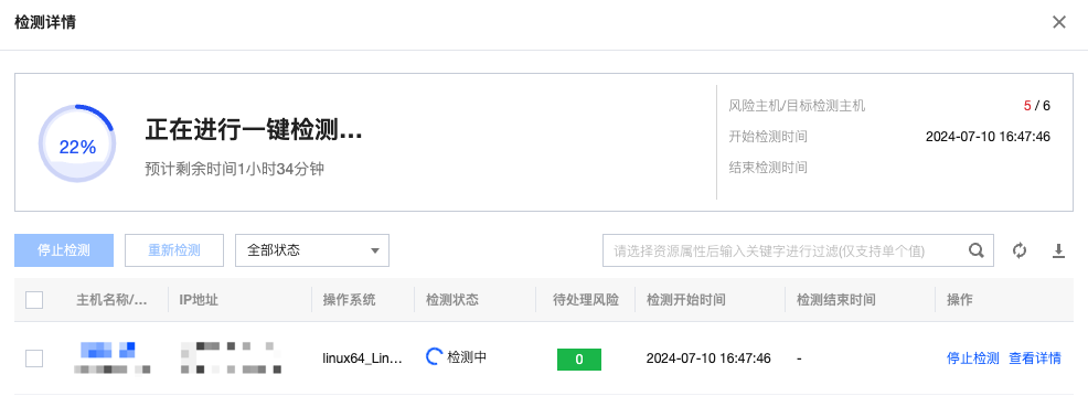 停止检测:若想对检测状态处于检测中的目标服务器停止检测,您可以单击停止检测。