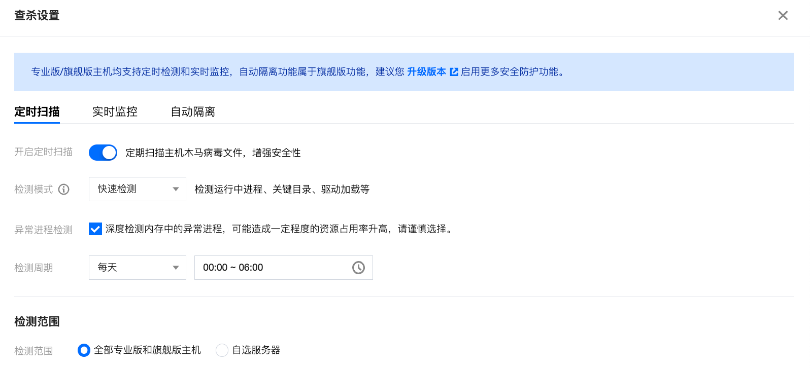 定时检测:单击开启定时扫描,设置检测模式、周期和检测范围后,单击保存,可定期扫描主机木马病毒文件,增强安全性。