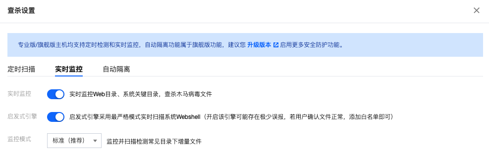 实时监控:单击开启实时监控,并选择监控模式后,单击保存,可实时监控 Web 目录、系统关键目录,查杀木马病毒文件。