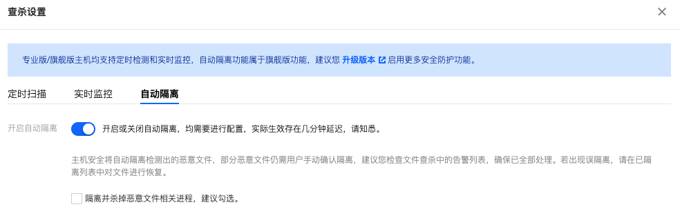 若出现误隔离,请在已隔离列表中对文件进行恢复。开启或关闭自动隔离,均需要进行配置,实际生效存在几分钟延迟。