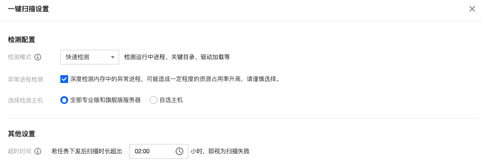 检测模式:包括快速检测模式和全盘检测模式,可对运行中进程、关键目录、驱动加载等进行检测。其中全盘检测的时长与服务器磁盘文件数量相关,推荐检测周期选择4小时以上,避免出现扫描不完整或超时情况。