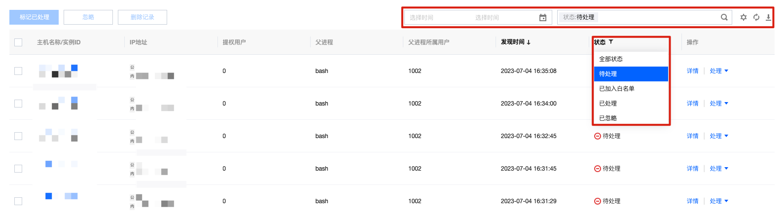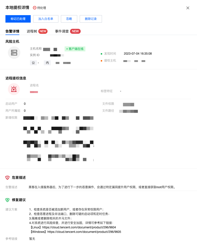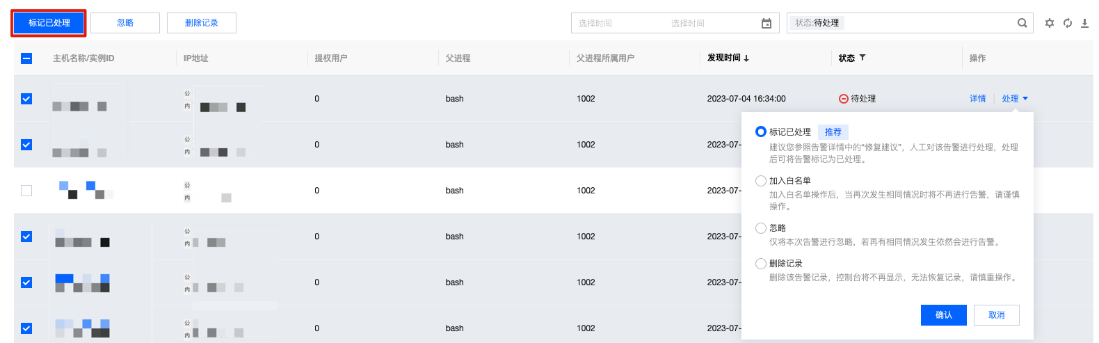标记已处理:支持单选或多选本地提权告警信息,人工对该告警进行处理,处理后可将告警标记为已处理。