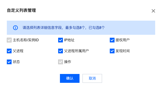 自定义设置列表字段:在本地提权告警列表上方,单击,可设置列表展示字段,选择完成后,单击确定,即可设置成功。