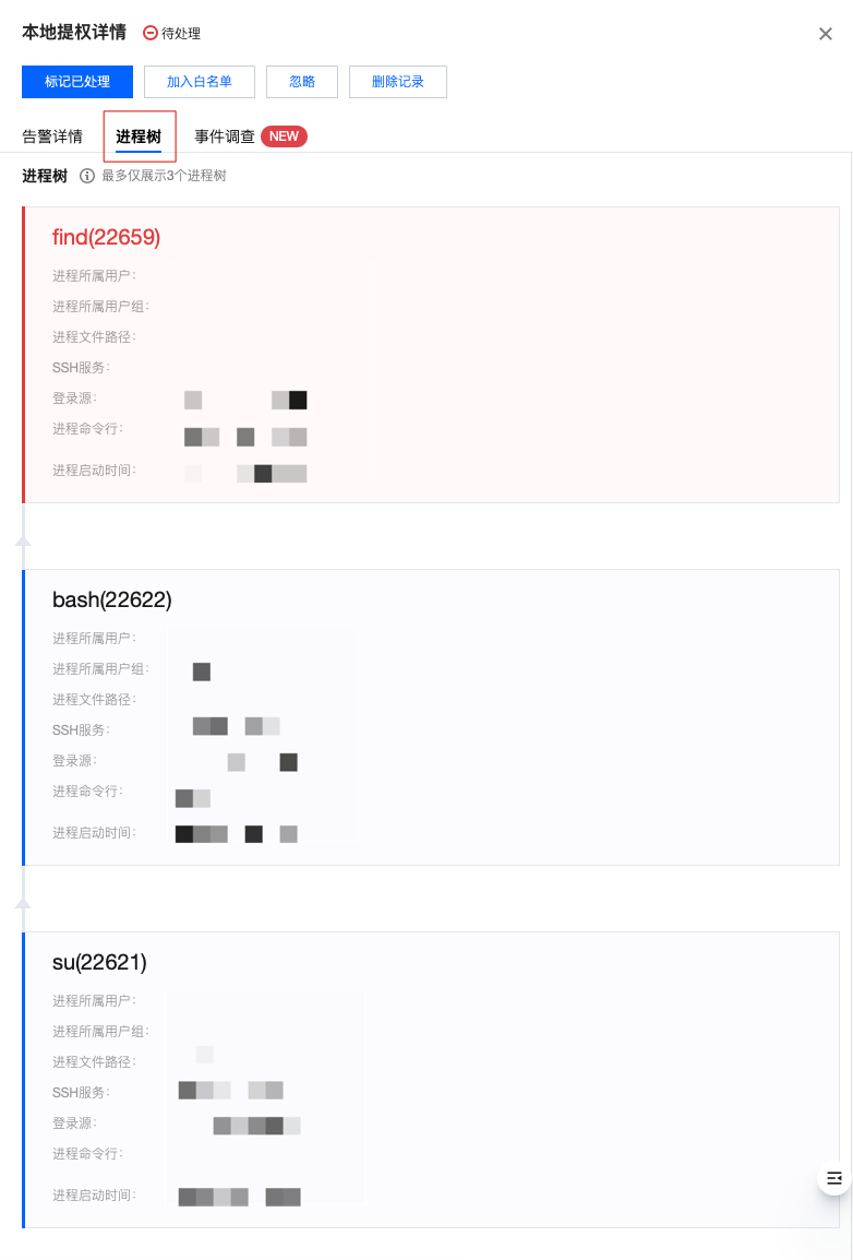 详情 > 进程树:在本地提权告警列表的右侧操作栏,单击详情选择进程树标签页,可查看以时间倒序排列的三个最新进程详情。
