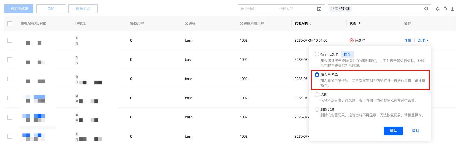 2.1.1 如需将本地提权告警事件加入白名单,可在告警信息列表的右侧操作栏,单击处理 > 加入白名单,或在详情页单击加入白名单。