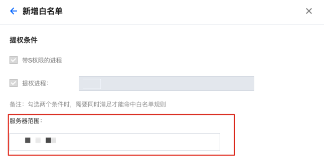 3. 在新增白名单页面,设置提权条件,包括:带 S 权限的进程、自定义提权进程(支持多个进程名,以英文逗号分隔,例如 123.exe,test.exe),同时选择该条件覆盖的服务器范围,单击确定。