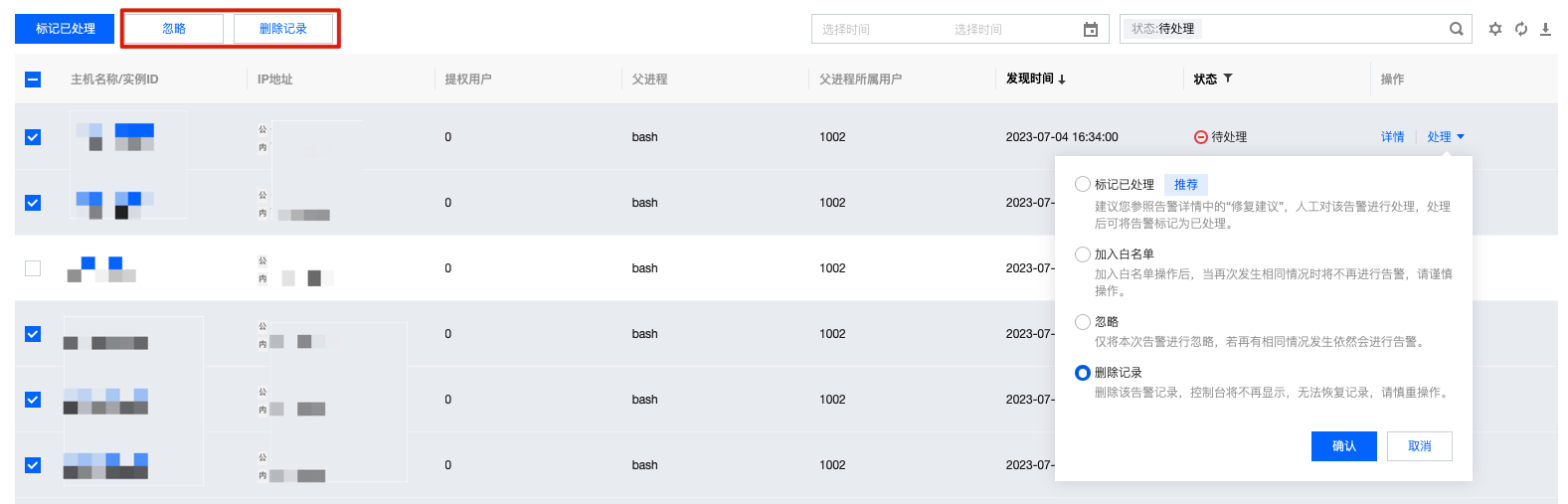 删除记录(慎重操作):支持单选或多选本地提权告警信息,删除选中的告警记录,控制台将不再显示且无法恢复记录。