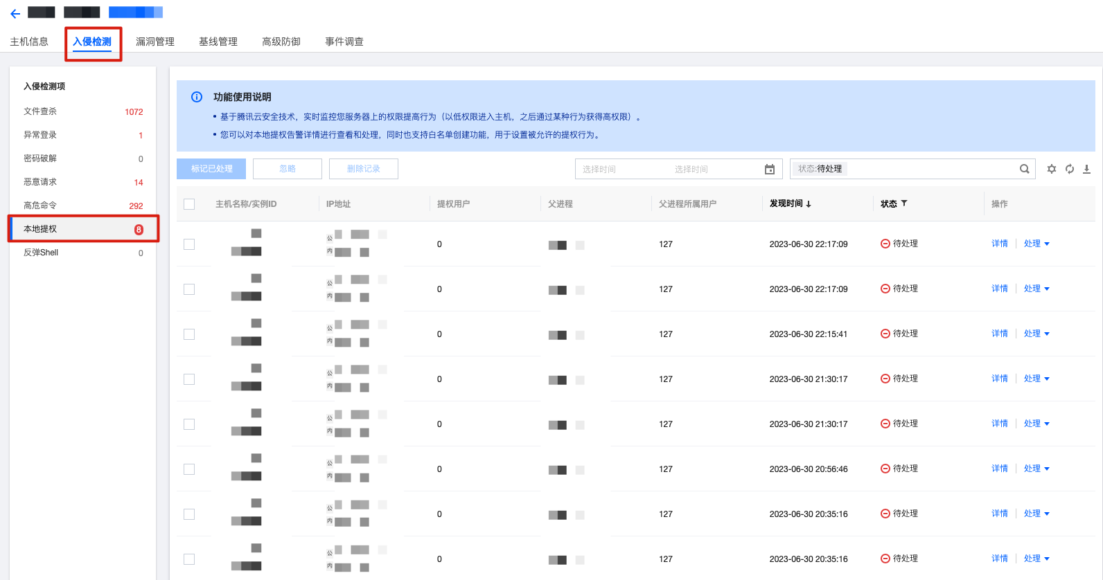 1. 登录 主机安全控制台,在左侧导航栏选择入侵检测 > 本地提权,进入本地提权的告警列表标签页。 2. 在本地提权的告警列表标签页,可查看本地提权告警事件列表,并进行相关操作。可查看发生提权事件的主机名称/实例 ID,IP 地址、提权用户、父进程、父进程所属用户、发现时间、状态、操作(详情 | 处理)共8个字段,展示列表详情信息可进行自定义。