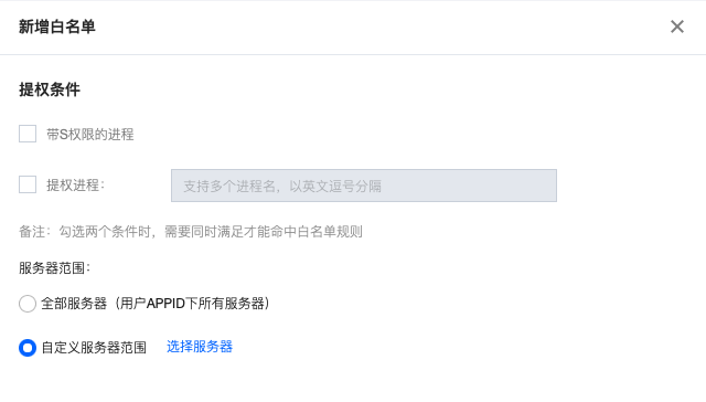若服务器范围选择全部服务器,将对用户 APPID 下所有服务器添加信任该白名单条件,请谨慎操作。