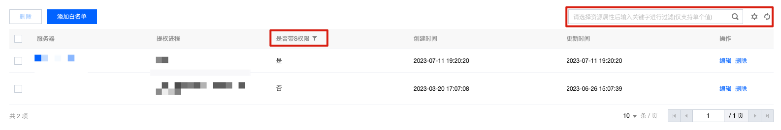 筛选:已配置的白名单支持按关键字及标签查询(多个关键字用竖线 “|” 分隔,多个过滤标签用回车键分隔)筛选,同时支持按是否带 S 权限进行筛选。