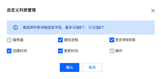 自定义设置列表字段:在白名单列表上方,单击,可设置列表展示字段,选择完成后,单击确定,即可设置成功。