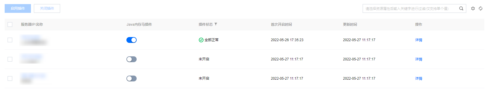 启用/关闭插件:Java 内存马插件默认关闭,支持用户手动设置开关,可单主机设置,也可多选主机批量设置。