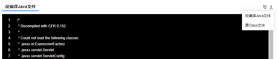 单击 Java 内存马详情中的查看文件,可查看落地文件的反编译 Java 文件,支持复制,支持下载反编译 Java 文件或原 Class 文件。