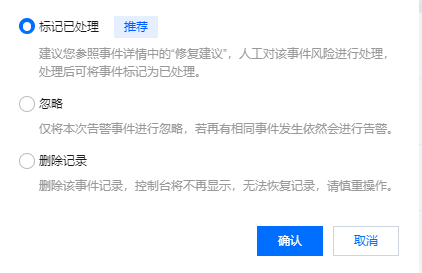 单击处理可对事件进行标记已处理、忽略、删除记录操作,可单事件处理,也可多选事件批量处理。