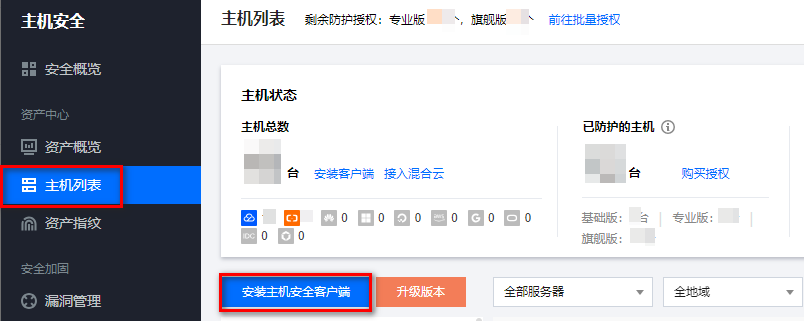 检查服务是否上线,先检查客户端是否安装成功,然后在 主机列表 可查看,服务器属“防护中”即服务已上线。 步骤3:升级主机安全版本