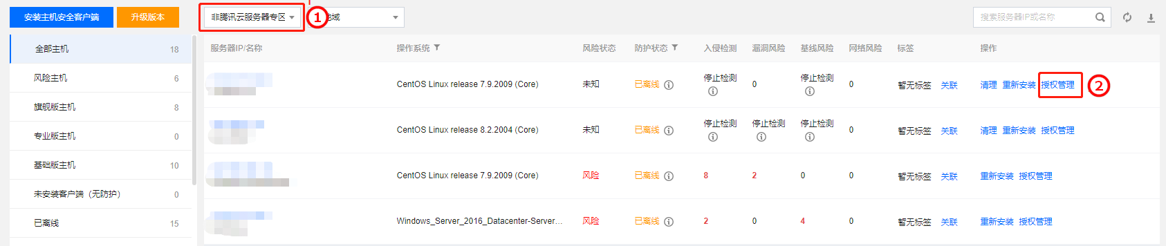 1. 单击选择非腾讯云服务器专区,即可查看对应服务器,单击授权管理即可进入授权管理页面升级为主机安全专业版或旗舰版。