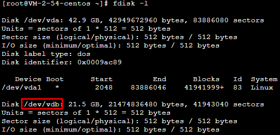 本文连接到实例的磁盘名称以 /dev/vdb 为例。如下图所示: