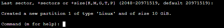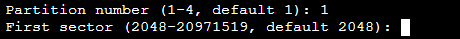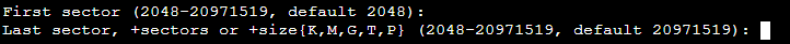 回显信息中 Last sector 表示截止磁柱区域,可以选择2048 - 20971519,默认为20971519。 6. 以选择默认截止磁柱编号20971519为例,按 Enter。如下图所示: