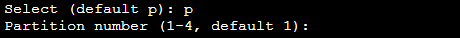 回显信息中 Partition number 表示主分区编号,可以选择1 - 4。如下图所示: 4. 以选择分区编号1为例,输入主分区编号 1,按 Enter。如下图所示: