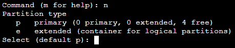 2. 输入n,按 Enter,开始新建分区。如下图所示: