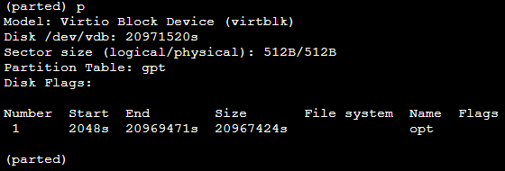 4. 以为整个磁盘创建一个分区为例,输入 mkpart opt 2048s 100%,按 Enter。