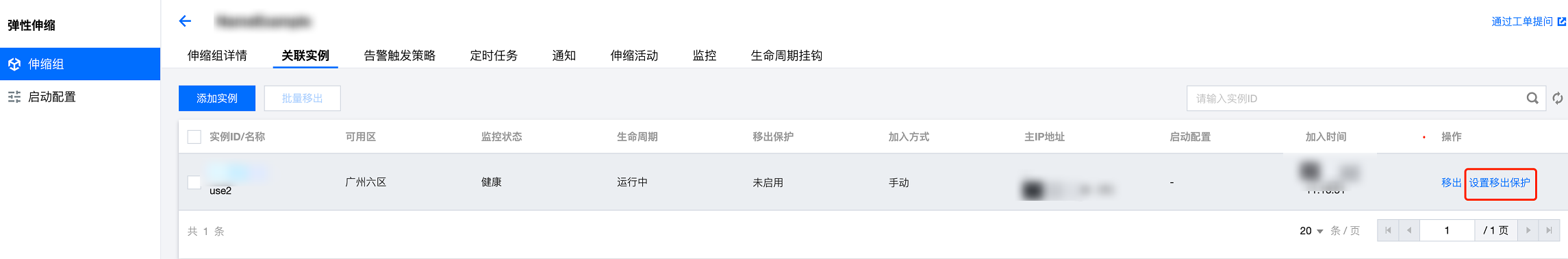 选择云服务器所在行右侧的设置移出保护,并在弹出框中单击确定。如下图所示: