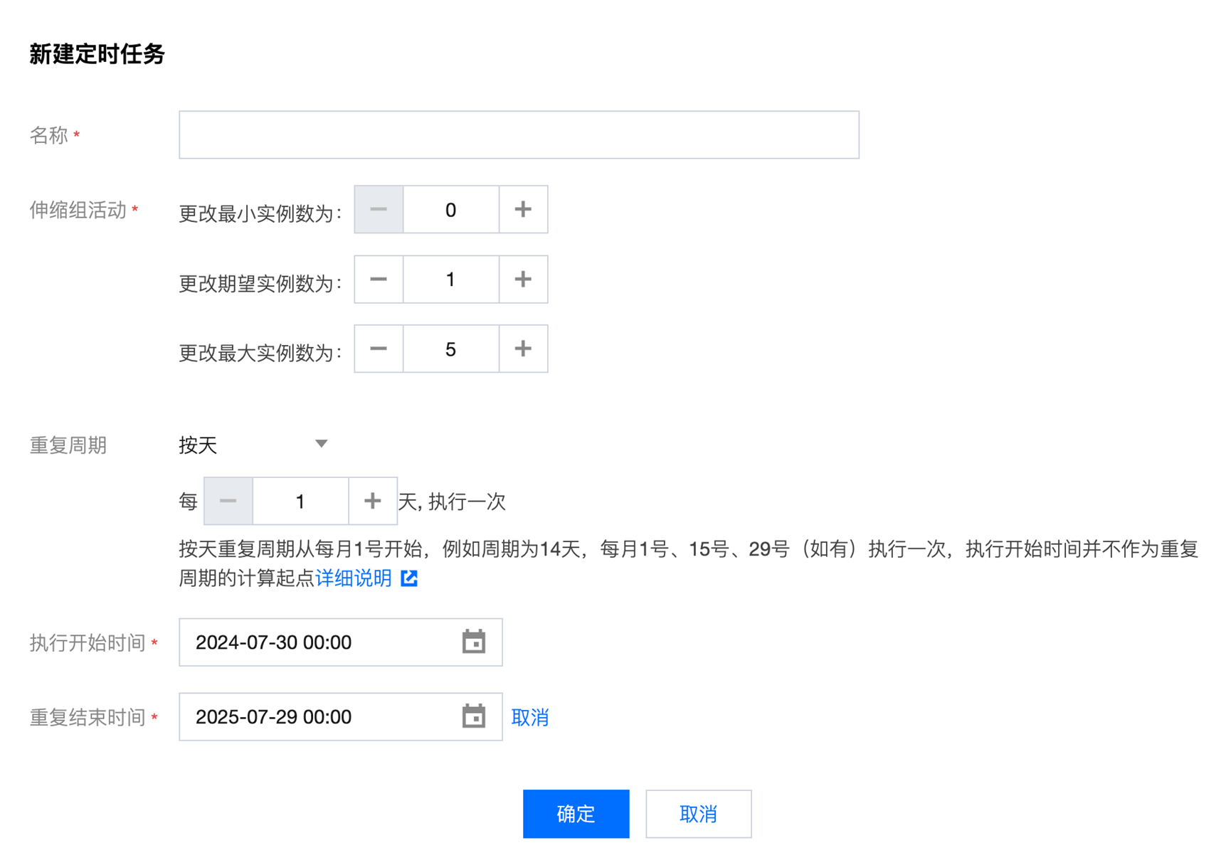 重复周期:伸缩组活动的周期,本文设置每天执行一次。