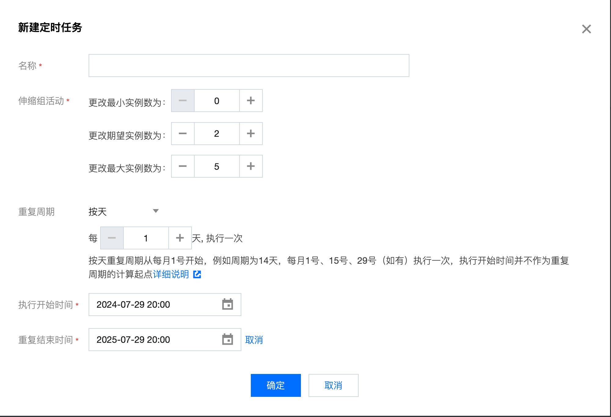 重复结束时间:伸缩组活动重复结束时间,即 2023-07-29 20:00 后不再重复。