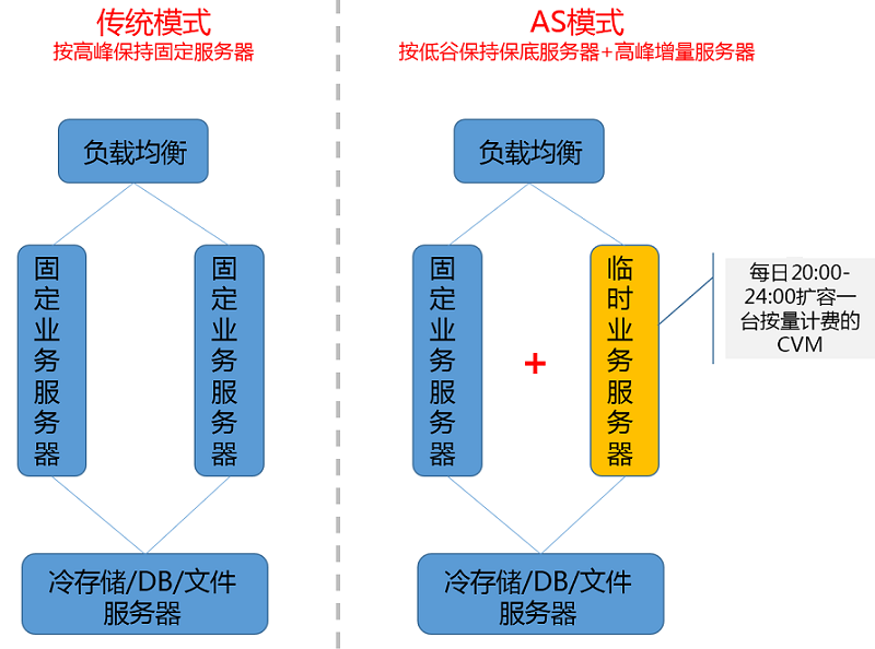 高峰时段采用按量计费的 CVM,通过定时任务在20:00扩容1台 CVM 实例,并在24:00进行缩容。