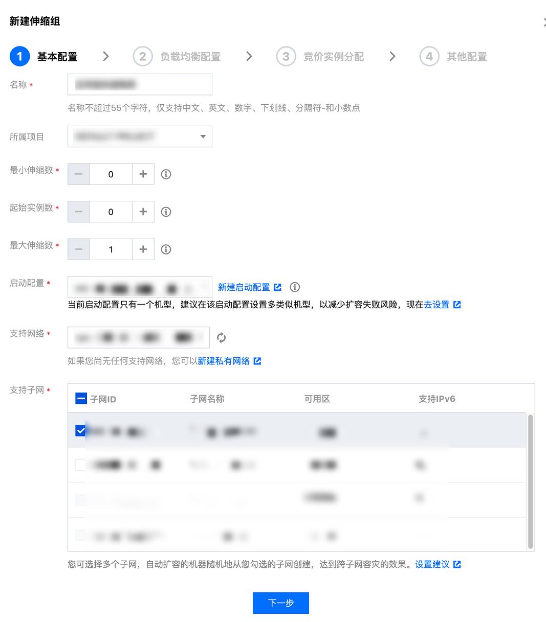 3. 在新建伸缩组页面,根据以下信息创建伸缩组,并单击下一步。如下图所示: