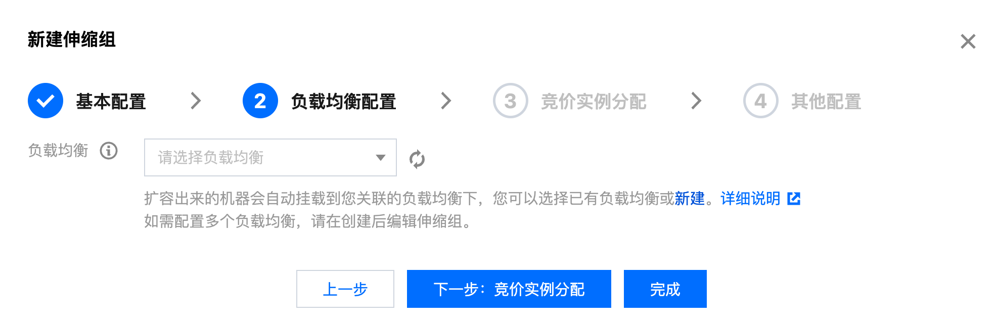 4. 选择负载均衡。扩容出来的机器会自动挂载到您关联的负载均衡下,您可以选择已有负载均衡或者新建负载均衡。确认无误后,单击完成,完成创建。入下图所示: