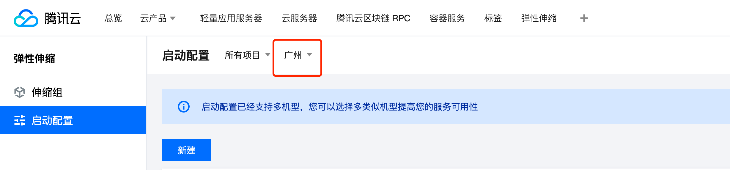 扩容时弹性伸缩以 启动配置 为模板创建机器,因此需要事先通过 启动配置 指定地域、机型、镜像。
