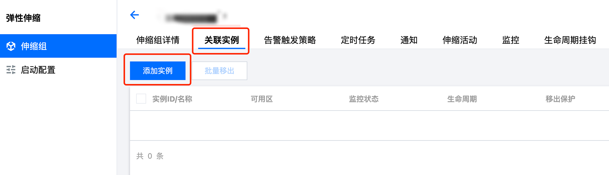 1. 在 伸缩组 列表页面,选择伸缩组 ID 进入该伸缩组管理页面。 2. 选择关联实例页签,并单击添加实例。如下图所示: