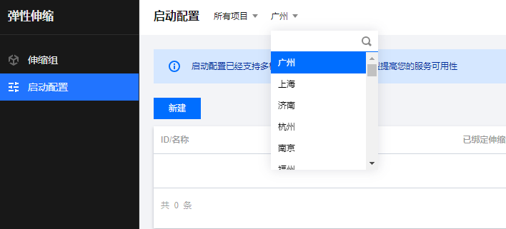 这里要注意选择伸缩组想要绑定的云服务器所在的地域,启动配置和伸缩组都是地域属性。例如,如果启动配置的地域选择了广州,那么只能绑定广州的伸缩组,自动添加的 CVM 也是广州的 CVM。