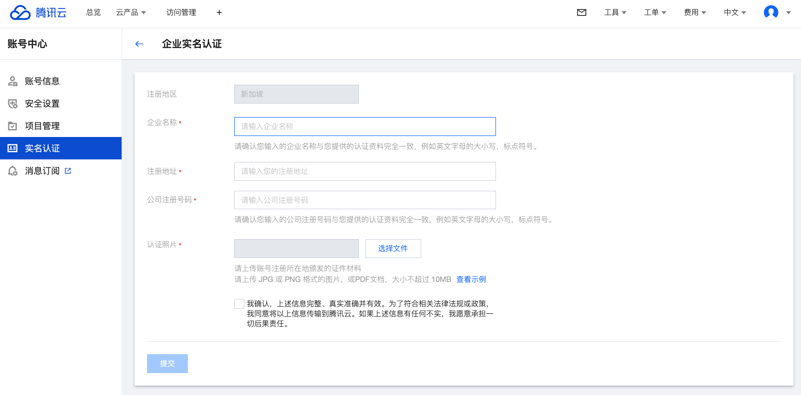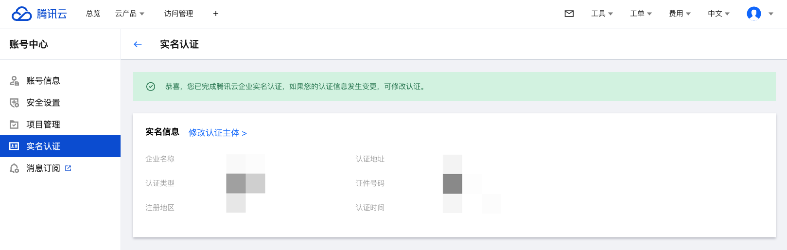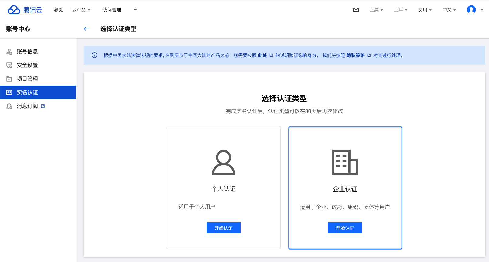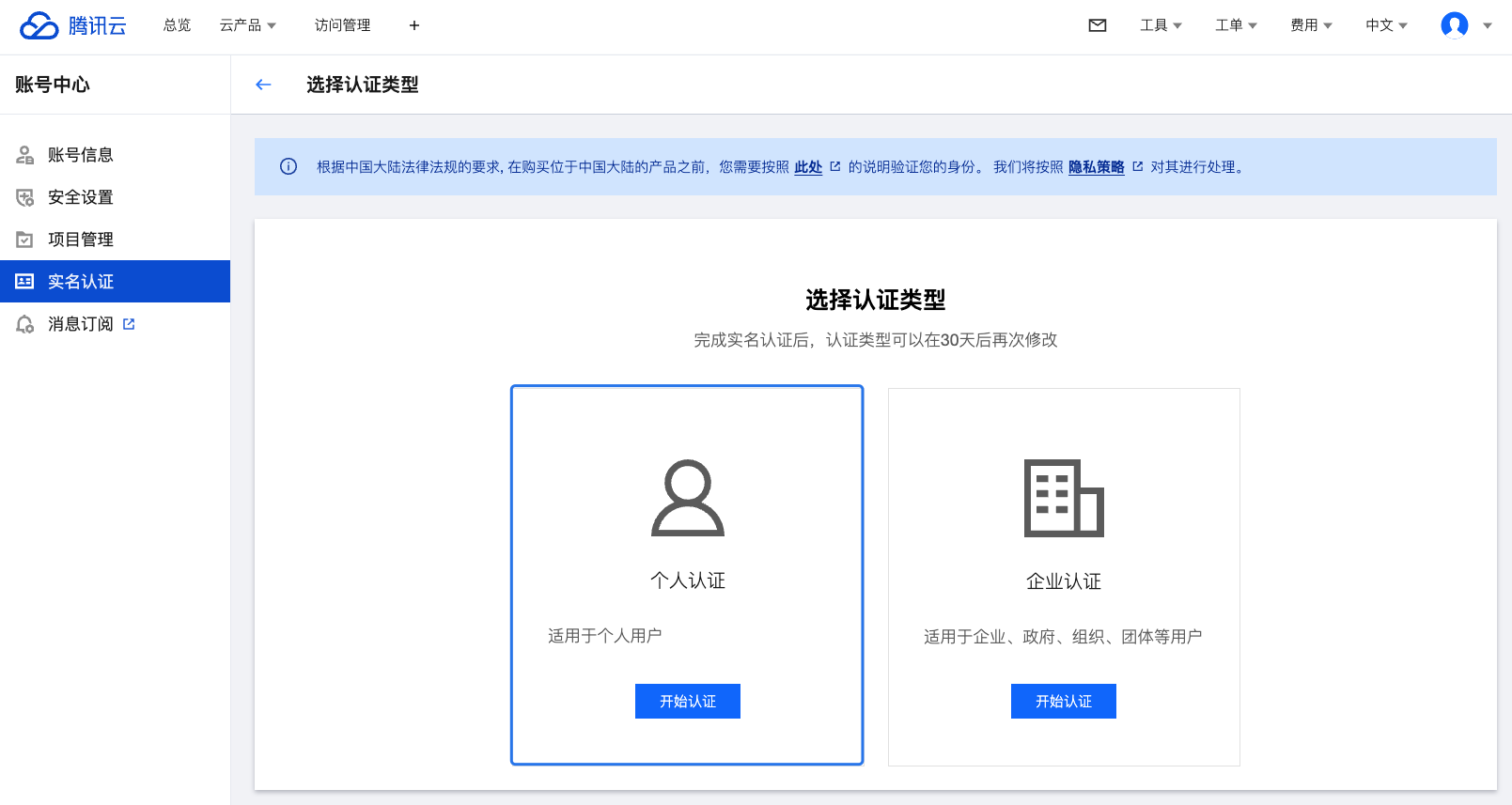 本文将指导您如何为已完成个人/企业 实名认证的腾讯云账号变更实名认证信息。实名认证信息决定账号归属。账号完成实名认证后,建议您不要随意修改认证的信息。