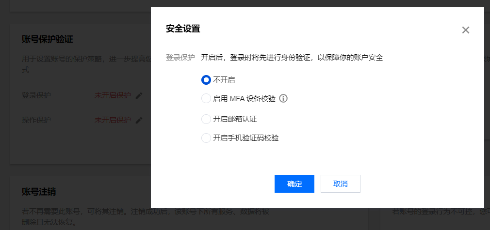 开启登录保护后,在登录腾讯云官方网站时需要验证身份。这样即使他人盗取您的密码,也无法登录您的账号,能够最大限度地保证您的账号安全。