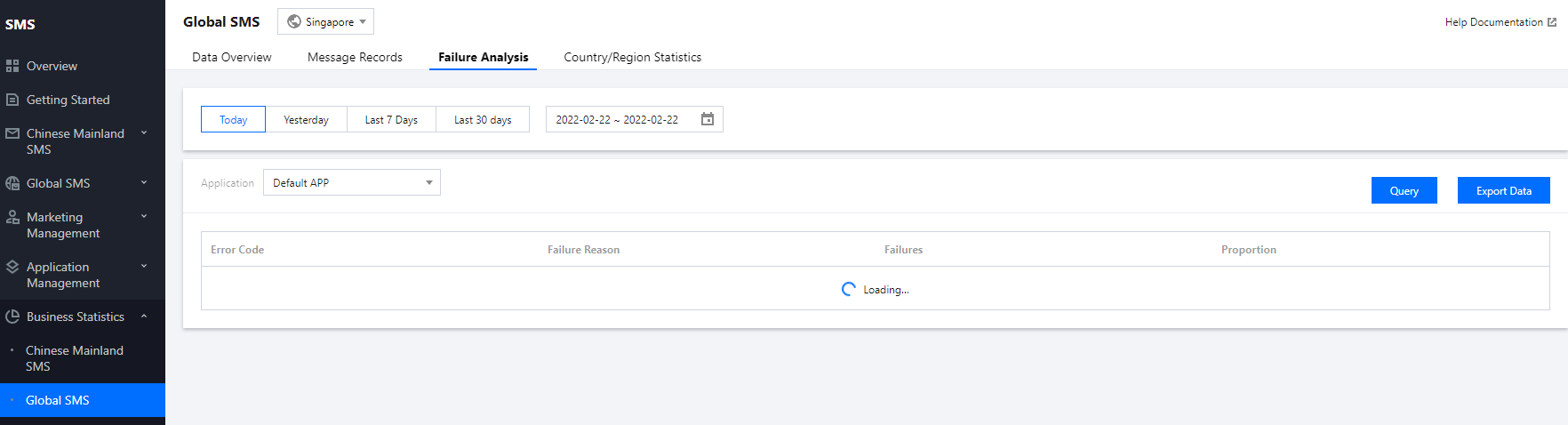 在失败分析页面,您可以指定应用筛选查看今天、昨天、最近7天、最近30天或指定时间段的短信发送失败详情和所占比例。