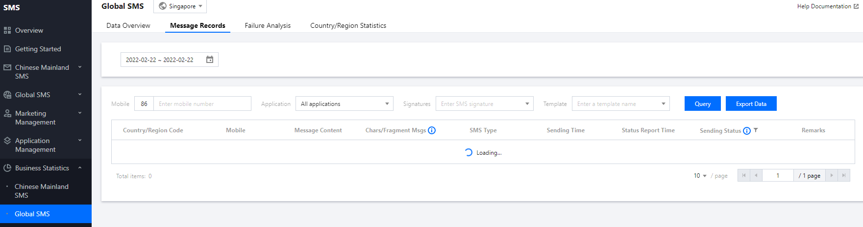 登录 短信控制台,在左侧导航栏选择统计分析 > 国际/港澳台短信,您可以查看指定时间段内的国际/港澳台发送详情、下发记录以及失败分析等。单击各页面的 导出数据 可下载对应数据表。 数据总览