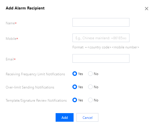 您可以添加告警联系人并配置具体的提醒事件,当触发提醒时,指定的告警联系人将收到提醒短信和邮件。提醒事件包括发送超量提醒、频率限制提醒、模板和签名审核通知。