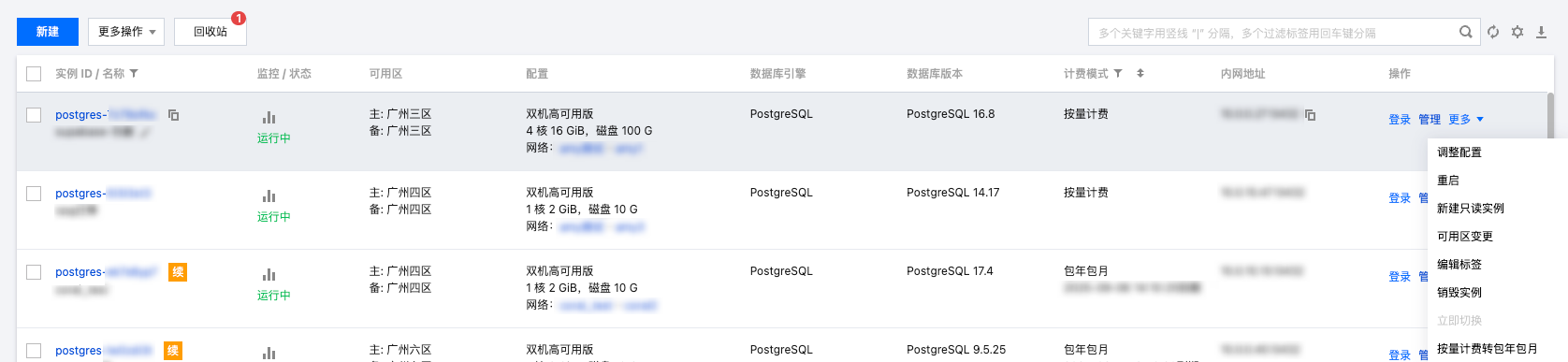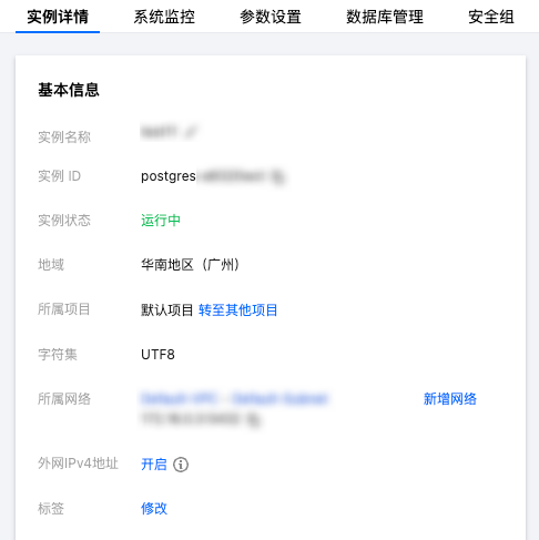 云数据库 PostgreSQL 创建完成后,在 实例列表 单击实例 ID 或操作列的管理,可以进入实例管理页面。您可以进行实例详情查看、实例监控、数据库管理等操作。 实例详情