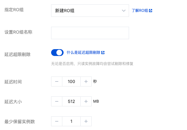 在只读实例 RO 组的配置界面,可以配置只读实例 RO 组的名称、延时超限策略、延时阈值、最少保留实例等基本信息。