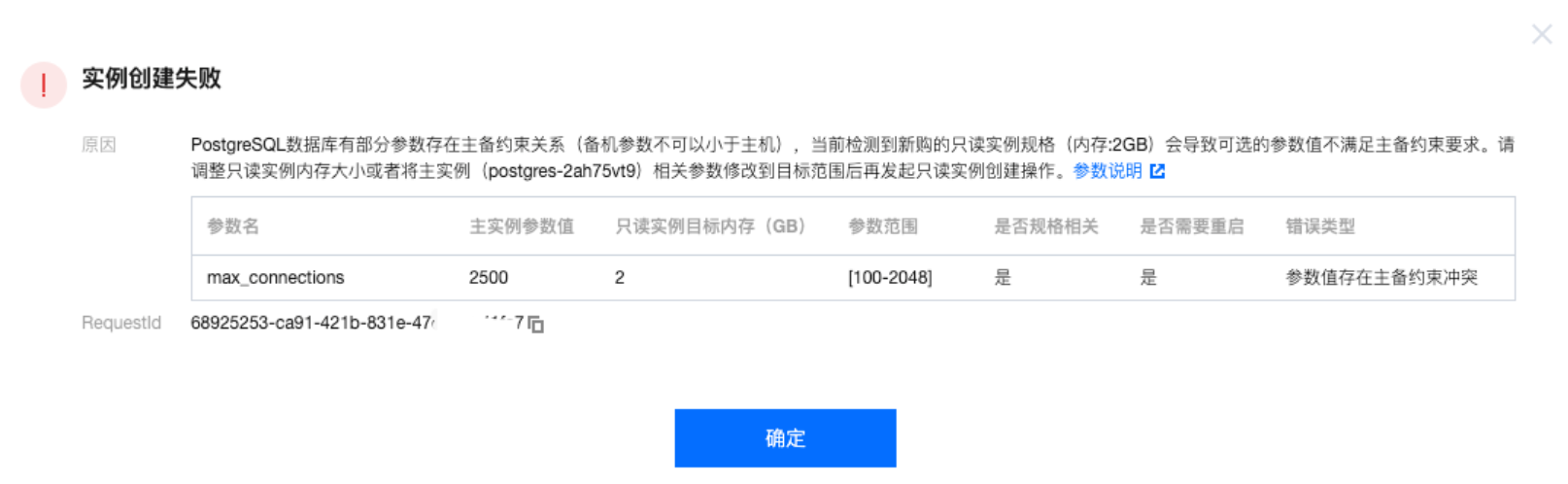 当 PostgreSQL 数据库主实例上关联一个只读实例时,必须在只读实例上设置某些参数等于或大于主节点上的参数值。否则,只读实例无法正常启动。例如参数 max_connections、max_worker_processes、max_wal_senders。创建只读实例时,若所选择的规格无法选择满足只读实例参数值等于或大于主实例的要求,则会给出相应的提示,如下图所示: